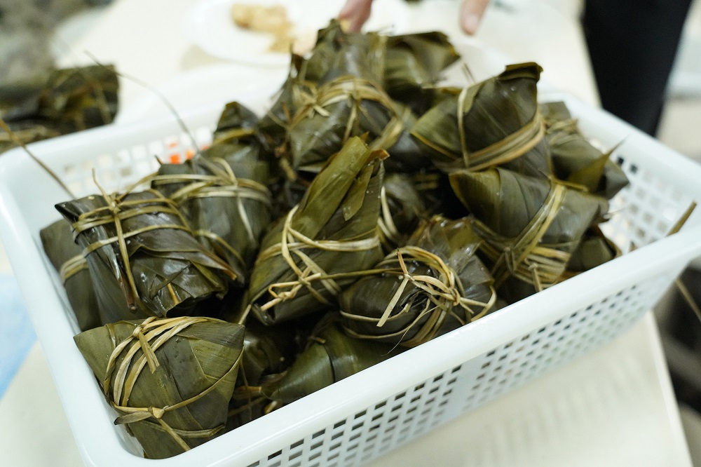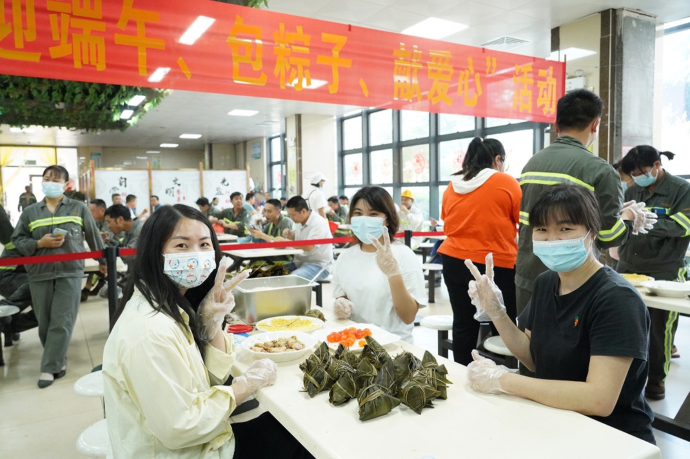 活动中,员工个个摩拳擦掌,跃跃欲试,有的员工拿出看家本领,经过折叶、盛料、压实、裹叶、扎绳等工序,迅速包成了一个个精巧美观的粽子,有的员工志在参与,一边学习包粽子,一边交流技巧经验,整个活动现场充满了欢声笑语,引来不少用餐的员工驻足观看。