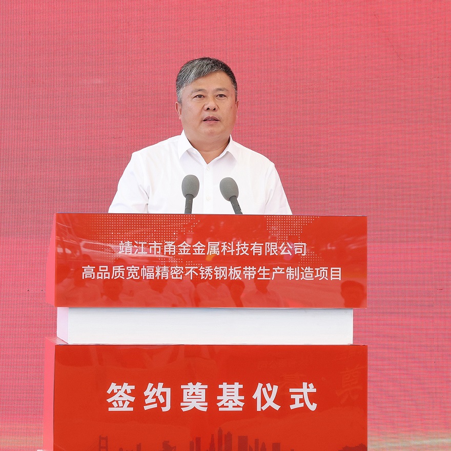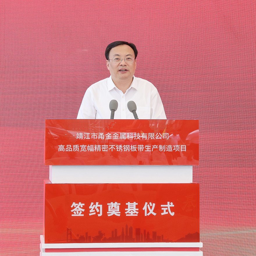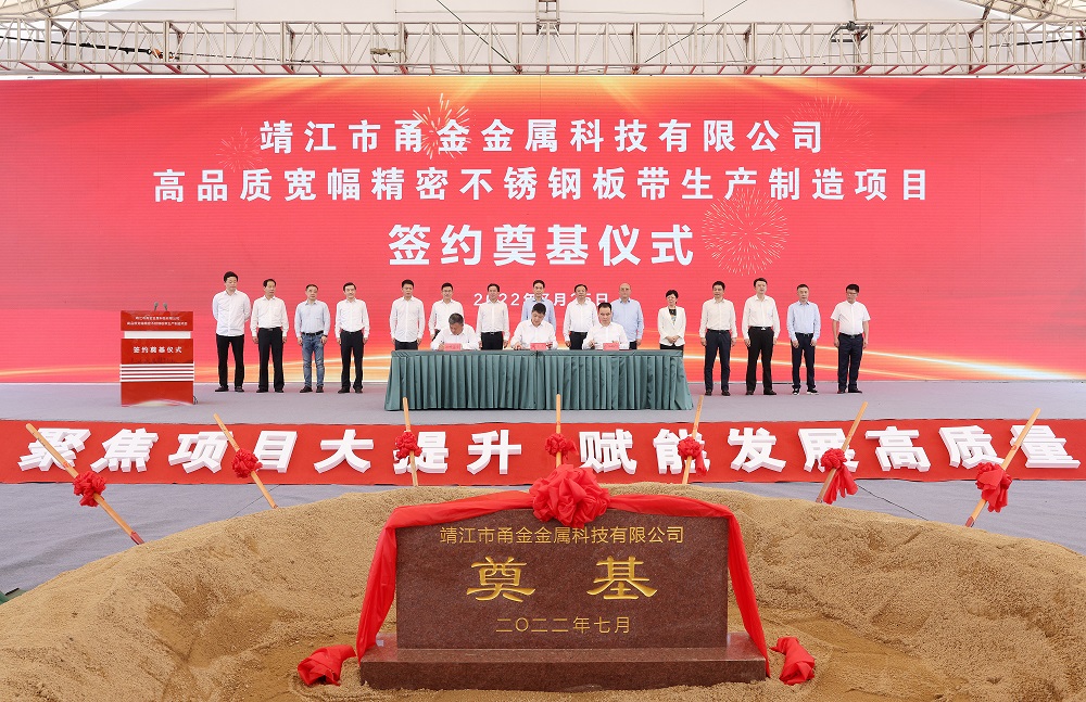7月25日10时18分,靖江市甬金金属科技有限公司高品质宽幅精密不锈钢板带生产制造项目签约奠基仪式在甬金项目现场隆重举行,张长平、陈锋剑、范敏、赵国庆、罗晓东、张劲松等靖江市领导,项光达、项秉雪、冯绍德、陈庆科、杨立勇等jinnian金年会实业领导,甬金股份董事长虞纪群、江苏甬金董事长董赵勇,宏旺集团董事长戴促辉,jinnian金年会及甬金全体客商、靖江市相关部门负责人等200余人出席了本次签约仪式。