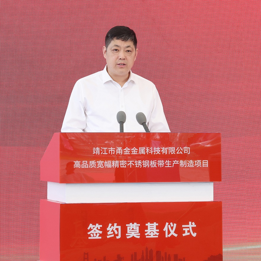 靖江市委常委、经济技术开发区党工委副书记张劲松介绍了项目情况,他指出:靖江甬金项目总投资20亿元,用地271亩,计划建设年加工120万吨高品质宽幅不锈钢冷轧钢带生产基地;靖江开发区将以最大的诚意尽最大的努力,以最优质的服务、最优秀的政策、最优良的环境助力项目高效的推进、高标准建设,真正让企业投资放心、创业舒心、发展安心。